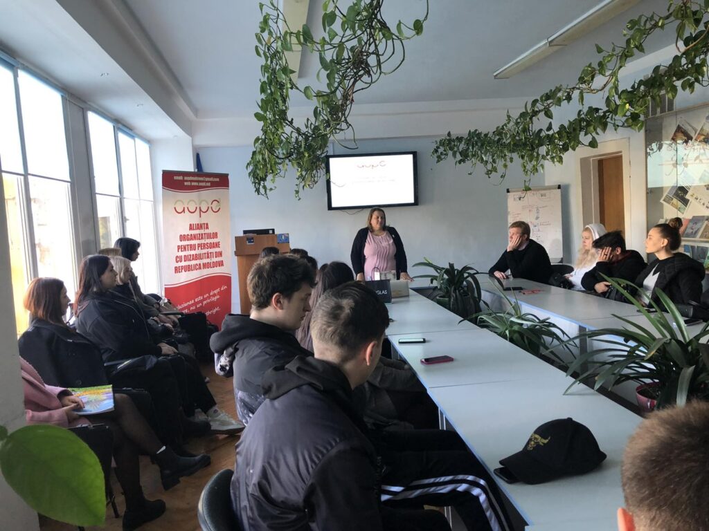 Directorul executiv al AOPD, Galina Climov, le-a vorbit studenților de la Facultatea de Jurnalism și Științe ale Comunicării din cadrul Universității de Stat din Moldova despre cum scriem și cum vorbim despre dizabilitate și persoanele cu dizabilități.
