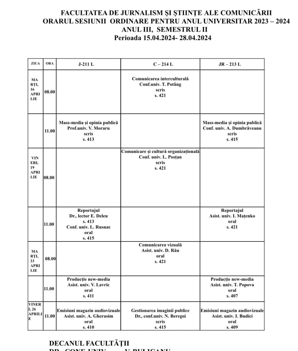 ORARUL SESIUNII ORDINARE PENTRU ANUL UNIVERSITAR 2023 – 2024