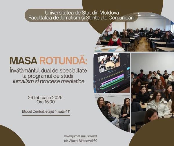 În calitate de organizatori ai evenimentului, avem deosebita plăcere de a Vă invita la masa rotundă: „Învățământul dual de specialitate la programul de studii: Jurnalism și procese mediatice”, care va avea loc pe 26 februarie, ora 15:00, la Facultatea de Jurnalism și Științe ale Comunicării, USM, str. Alexei Mateevici, 60, Blocul Central, etajul 4, sala 411.